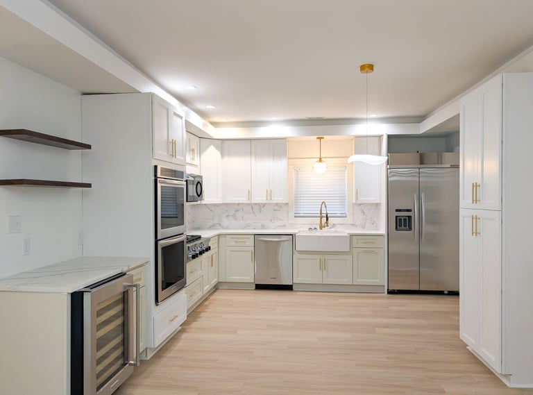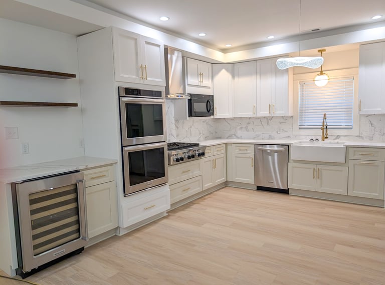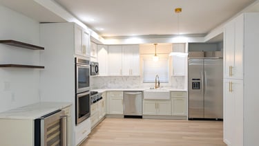 Cocina remodelada con distribución abierta y acabados de alta demanda. Gabinetes claros con herrajes dorados, iluminación empotrada y electrodomésticos en acero inoxidable que aportan un look moderno y atractivo para reventa o renta.