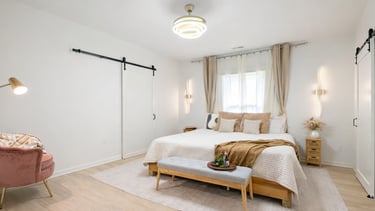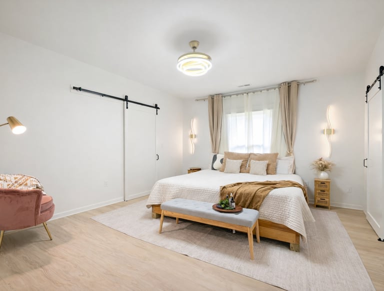 Habitación renovada con diseño moderno y acogedor. Iluminación decorativa, puertas tipo barn door, pisos en tono claro y una distribución amplia que aporta comfort y funcionalidad. Un espaio cuidadosamente diseñado que incrementa el atractivo y la percepción de valor de la propiedad.
