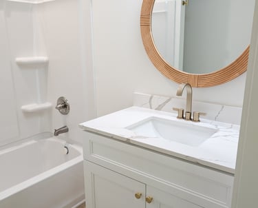 Baño renovado con acabados limpios y modernos. Vanity en tono claro con encimera tipo cuarzo, grifería en acabado dorado y espejo decorativo que aporta calidez y estilo. Un espacio funcional y luminoso que eleva la percepción de calidad de la propiedad.