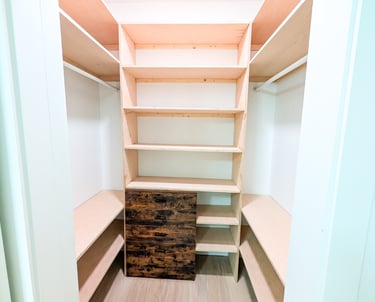 Walk-in closet diseñado a medida con solución de almacenamiento funcional y bien distribuida. Estanterías abiertas, cajonera central y espacios optimizados que maximizan organización y aprovechamiento del espacio. Un detalle práctico que añade valor y funcionalidad a la propiedad.
