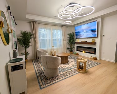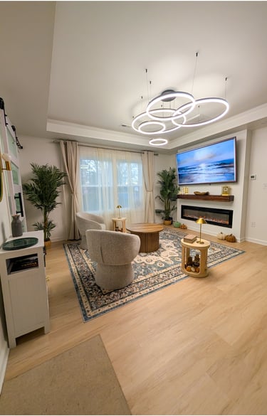 Sala renovada con un diseño moderno y elegante. Iluminación decorativa contemporánea, techos con detalle arquitectónico y pisos de tono claro que aportan amplitud y luminosidad. Un espacio versátil, ideal para mejorar la presentación y el valor de la propiedad.